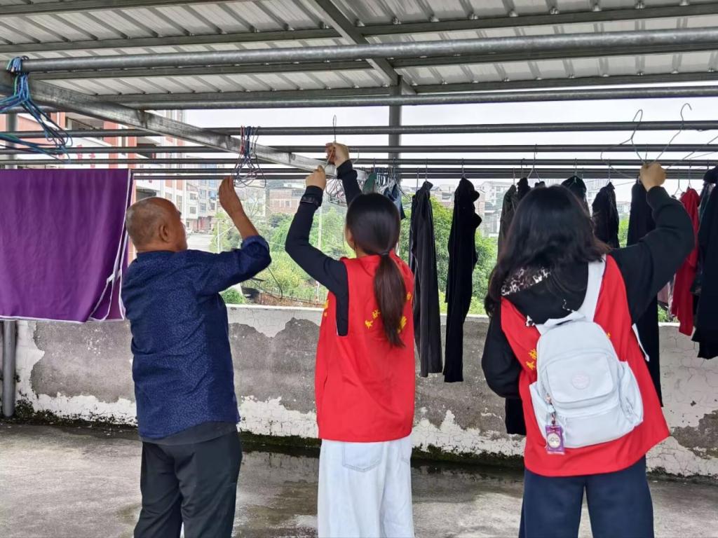 温馨的交谈过后,志愿者们迅速行动起来,开启了“安居焕新行动”。大家分工合作,干劲十足。一组志愿者细心帮助老人将需要晾晒的衣被抱到阳台晾晒;另一组志愿者则拿起扫帚和抹布,认真清扫院落里的落叶,擦拭门窗玻璃;还有一组志愿者帮助老人整理房间内的物品,让空间变得更加整洁有序。志愿者们用实实在在的劳动,将关怀融入每一个细节,切实改善了老人们的居住环境,为他们营造了一个更加整洁、舒适、安全的生活空间。看着焕然一新的院落和房间,老人们的笑容更加灿烂,这正是志愿服务最朴实也最动人的价值体现。