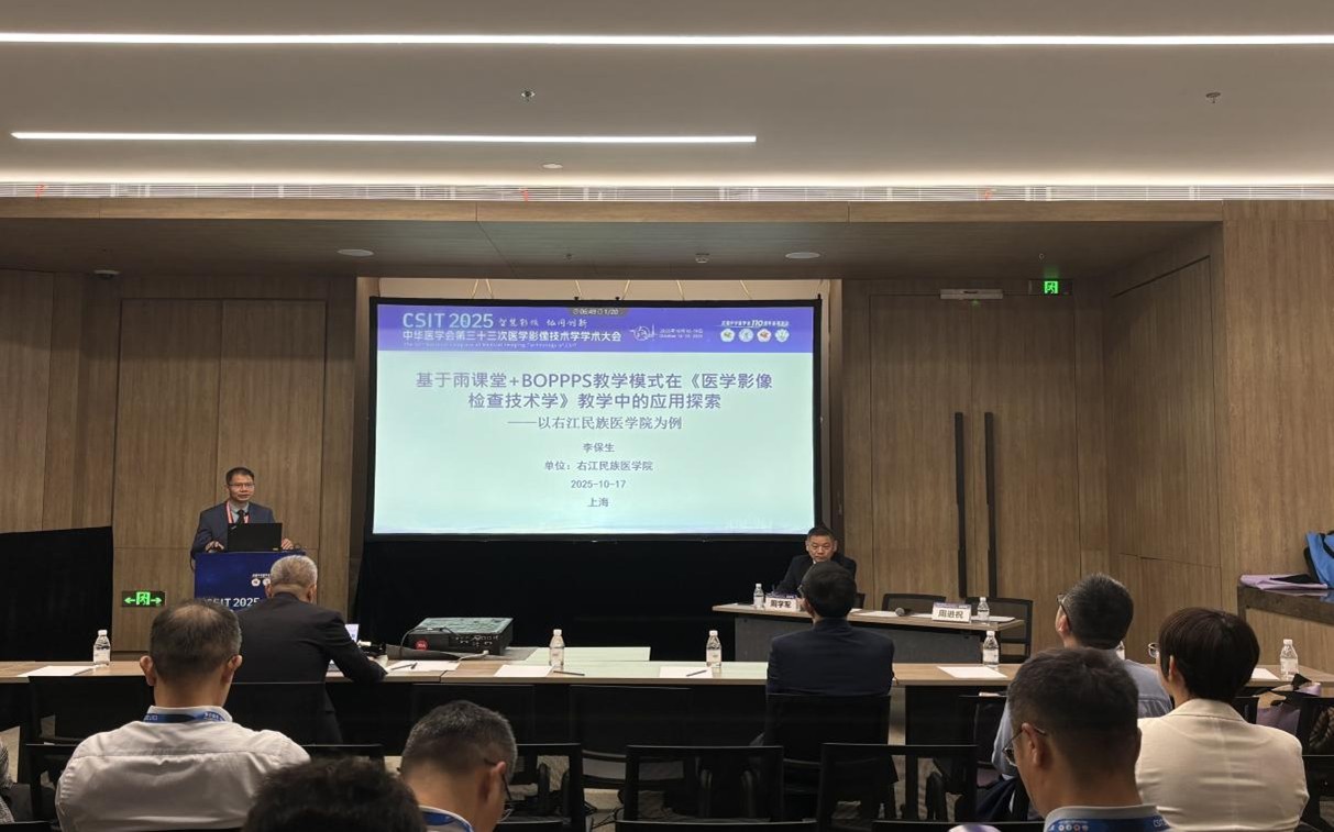 2025年10月17日至19日,中华医学会第三十三次医学影像技术学学术大会在上海张江科学会堂隆重举行。此次大会吸引了全国医学影像领域的众多目光,右江民族医学院医学影像学院李保生教授、黄叶梅讲师受邀参会,并分别围绕医学影像教育创新与AI技术应用作精彩分享,充分展现了我校在医学影像技术教学领域的学术实力与创新探索精神。