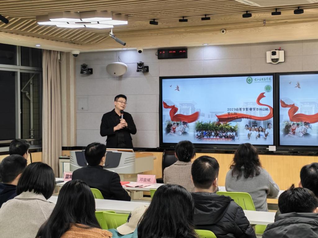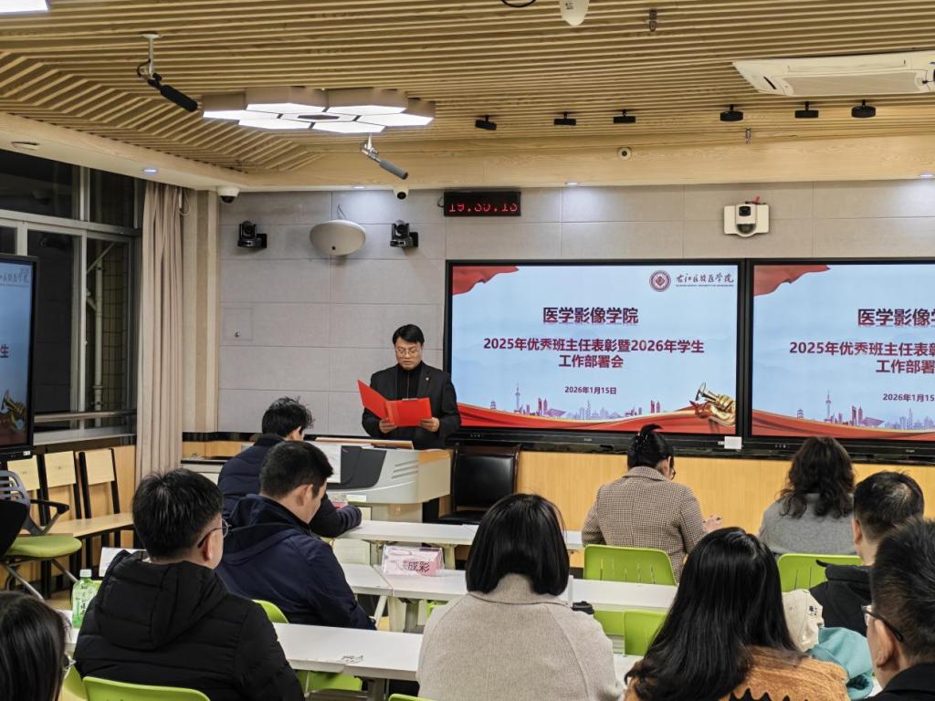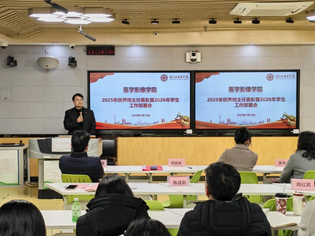 为深入贯彻全国教育大会精神,落实立德树人根本任务,强化班主任队伍建设,提升育人工作专业化水平,2026年1月15日晚,医学影像学院在7栋402智慧教室隆重举办第一期“红影育人”班主任能力提升沙龙。学院党政领导班子全体成员、院长助理、各教研室主任、班主任及辅导员共计30余人齐聚一堂,共话育人之道、共商提质之策。本次沙龙由学生科科长陈莎主持。