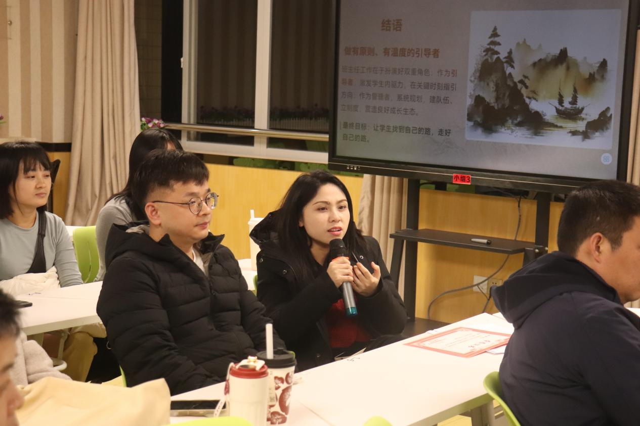 在经验分享环节,三位优秀班主任代表结合自身实践经验,带来了干货满满的育人智慧。黄婷老师以“制度引领+人文关怀+全员参与”为核心,系统阐述了三位一体的班级建设模式;罗仁刚老师聚焦“三红育人”与专业教育深度融合,详细讲解了将价值引领融入育人实践的路径;赵玲娟老师以“仁爱沟通”为基石,提出了“一体两翼”的系统化工作思路。三位老师的分享既有理论高度,又有实践温度,引发了现场与会人员的强烈共鸣与深入思考。经验分享结束后,进入现场答疑环节,结合班级管理实际,在场的老师们分享困惑、交流妙招,有效摆脱了部分班主任的工作困境,形成了多项务实有效的解决方案。