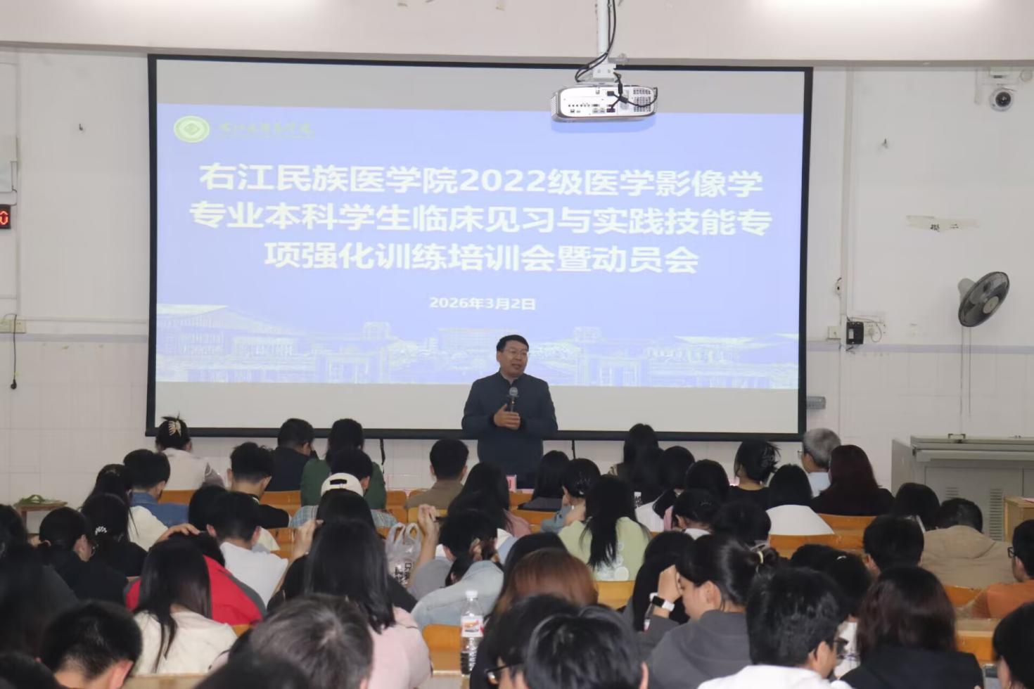 会上,杨尚霖副处长对《右江民族医学院2022级医学影像学本科专业临床见习与实践技能专项强化训练方案》作了详尽解读。他指出,本次训练与水平测试、考研及执业医师考试同向同行、紧密衔接。针对上一年度技能考核中暴露的薄弱环节,学校专门遴选了6家优质教学基地,开展为期6周的集中强化训练,实行小班化教学与精细化管理,着力补齐学生临床技能短板。